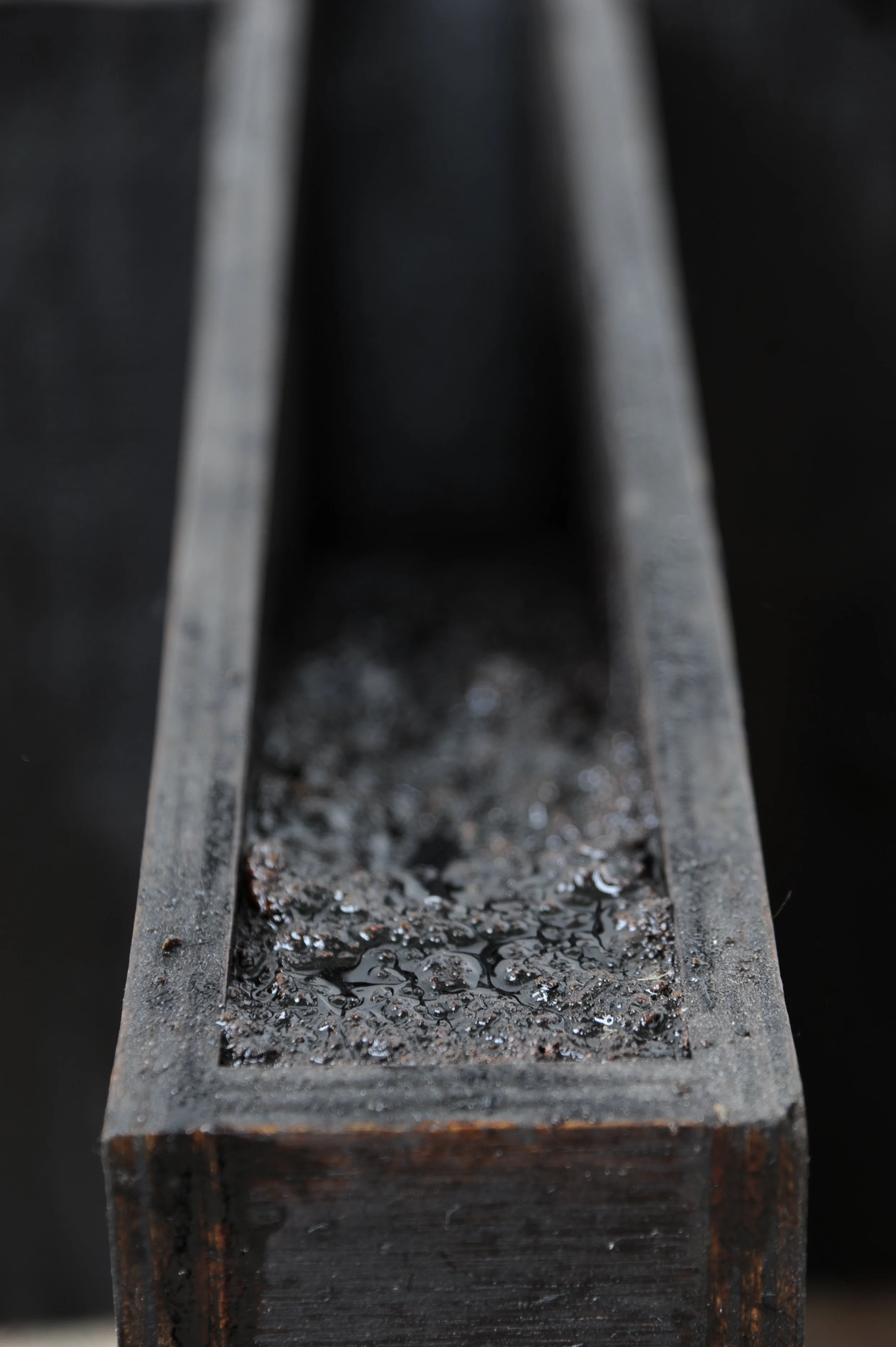 Untitled, detail (2019) Wood, concrete, tar, 224 x 65 x 118 cm